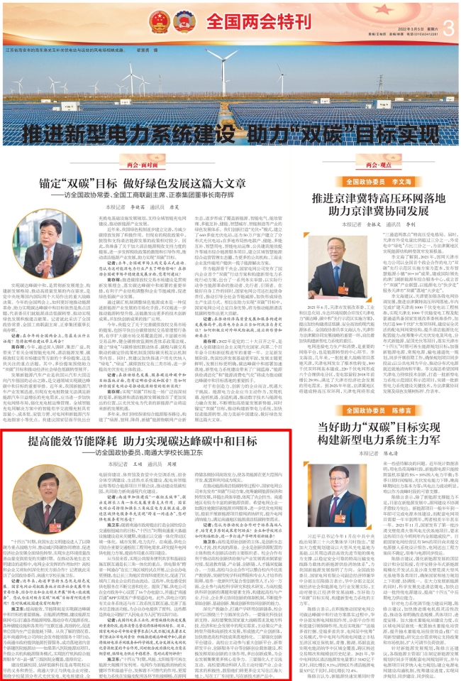 【開欄的話】今年是黨的二十大召開之年。今年的全國兩會,是進入全面建設社會主義現代化國家、向第二個百年奮斗目標進軍新征程的一次重要會議。兩會期間,部分代表、委員充分肯定公司探索新型電力系統建設在江蘇落地實踐,助力江蘇經濟社會高質量發展的舉措和成效,并對供電服務工作提出發展建議。公司網站將擇要發表相關報道,敬請關注。